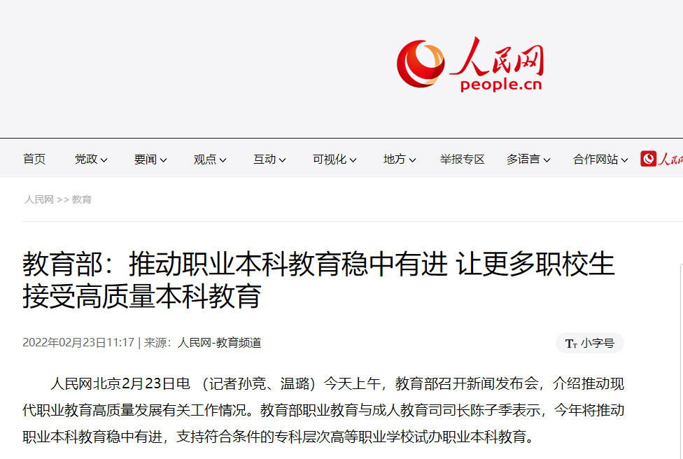 目前全国共有本科层次职业学校32所,职业本科在校生人数达12.93万人。《关于推动现代职业教育高质量发展的意见》明确提出:到2025年,职业本科教育招生规模不低于高等职业教育招生规模的10%,职业教育吸引力和培养质量显著提高。