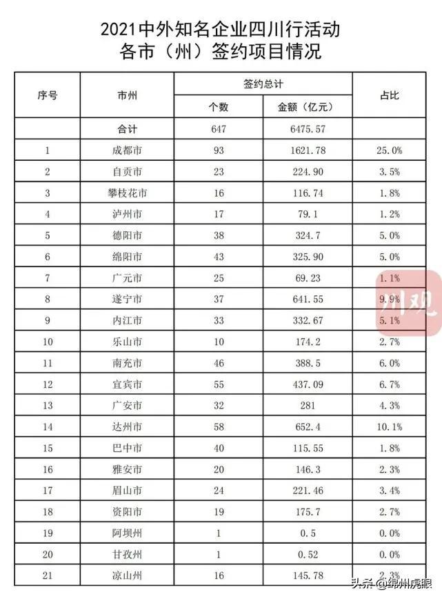 其实,虎眼梳理了一下,这些年来,全省统一签约,绵阳的位次都不是很靠前,但是,并不影响“2020年,绵阳实现国内省外到位资金788.2亿元、总额连续5年保持全省第2位,实现到位外资2.04亿美元、总额连续3年保持全省第2位。”