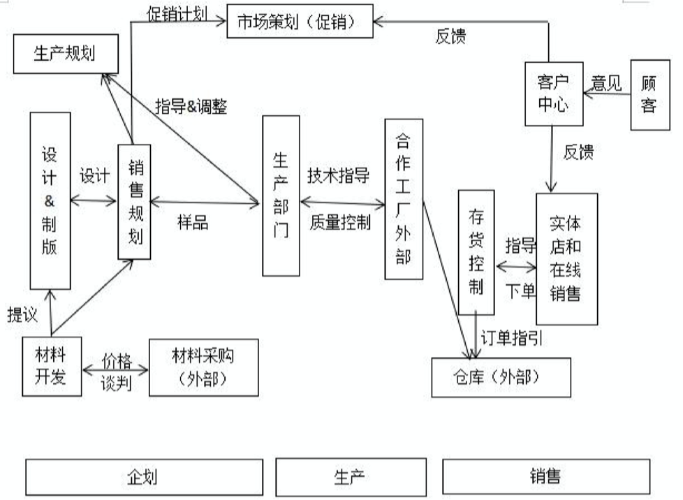 仓库在收到生产工厂发来的服装之后,会按照各个店铺的订单,把服装按订单依次发往各个门店。商品到达门店后,店长根据每周的销售计划对所有的商品按颜色、尺码在卖场陈列并管理销售进度。总部管理库存的部门,会根据店铺上传的销售和在存情况,下达下一步的补货或退货指示。