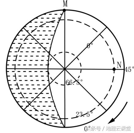 读地球某时刻太阳光照示意图,图中阴影部分表示黑夜,圆圈表示纬线,直线表示经线,箭头表示地球自转方向,据此完成21~22题。