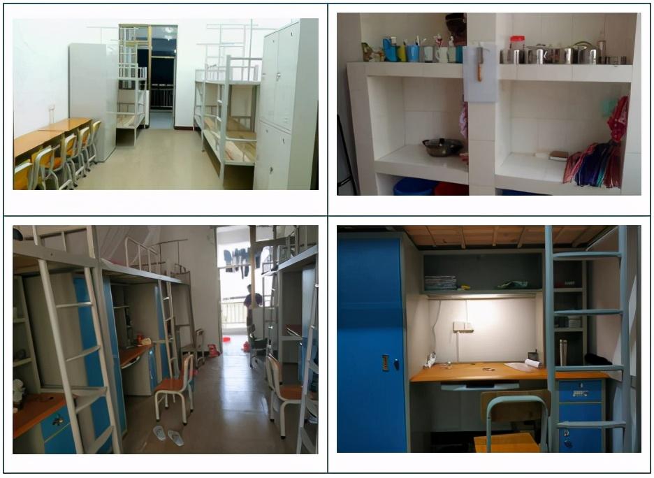 二级公寓,可住8人。全部学生宿舍设有衣柜、电话机、并配有电源、电脑上网端口。6人宿舍:上床下桌;8人宿舍:上下床