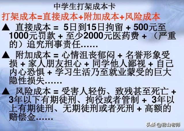 3、班会是班主任特别好的管理工具。如果有校园暴力的苗头出现,班主任可以通过班会来引导。比如,在班会上分享校园暴力案件,分析校园暴力给同学、给家庭造成的伤害,这里可以通过分享受害人的照片、案件视频报道等形式加深学生对校园暴力的思考,最后,还可以重拳出击,向学生出示惩治校园欺凌的法律法规条文,给学生算一算打架的成本!