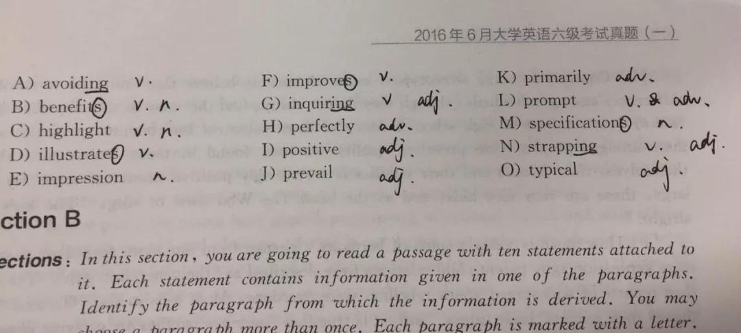 先不要读文章,直接看文章下面15个选项,把每个选项的词性像这样标记出来,同时把一些➕s, ➕ing, ➕ed这些标注一下,方便我们后面做题。