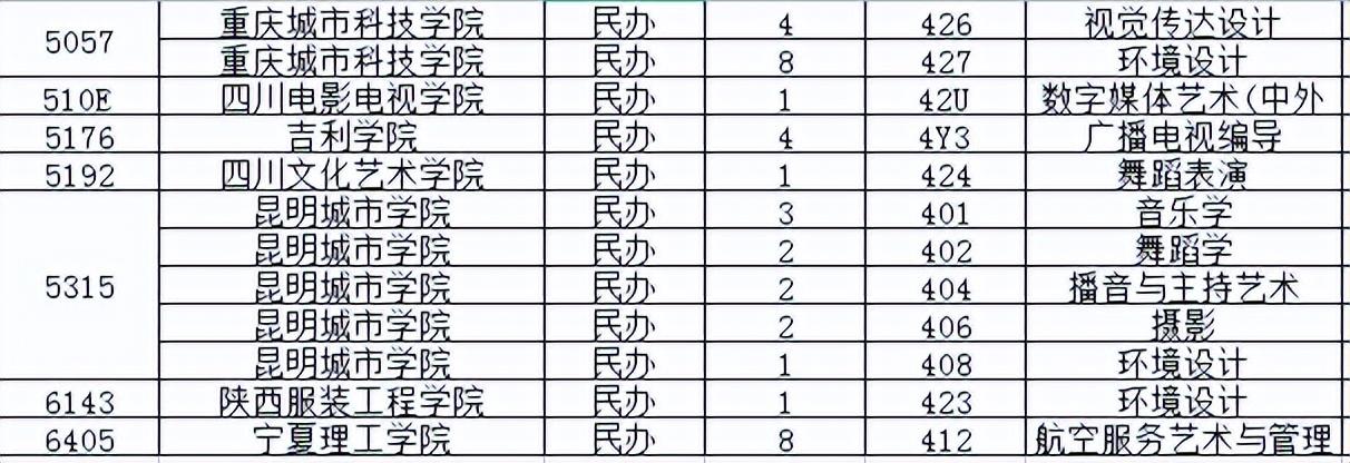 在参与征集志愿的6所公办本科高校中,北部湾大学和四川轻化工大学各征集音乐表演专业3人、重庆师范大学征集音乐表演专业1人、东北师范大学征集音乐学师范类专业1人,另外还有遵义师范学院征集播音与主持艺术类专业1人,西安交通大学征集美术类的环境设计专业1人。