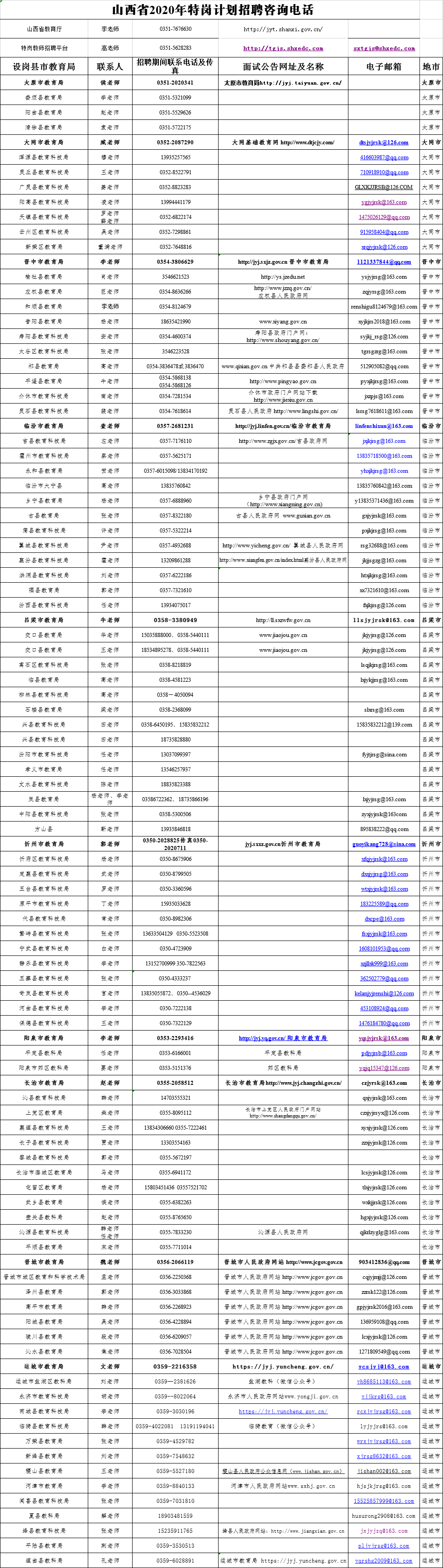 招聘过程中的未尽事宜请向有关招聘市、县(市、区)教育局咨询。附:2020年山西省特岗计划招聘咨询电话