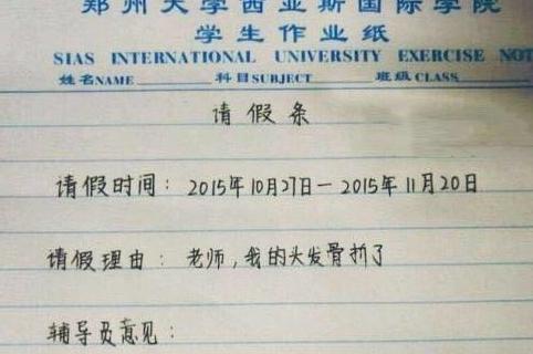 云老师曾看过这样一个请假条,请假理由一般人都想象不出来,更别提敢写下来找辅导员审批了,不过云老师不得不佩服这位同学天马流星的理由,看之前请控制你的笑声,他的理由是“头发骨折”,云老师看到的第一反应就是张口大小,他的辅导员看到后都捧腹大笑。