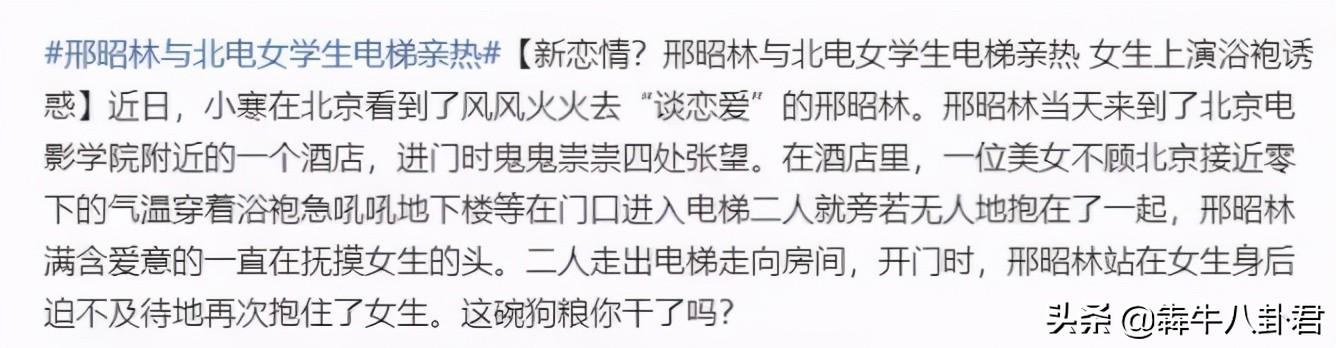 大家都知道娱乐圈颜值特别高,无论是男星还是女星都不缺异性朋友。近日邢昭林就被爆出刚拍完戏,就着急去酒店与北电女学生在电梯亲热的消息。