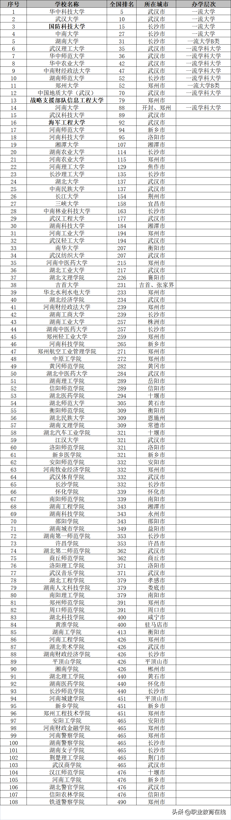 大城市往往配备着好大学,这三个省会都有着一流大学,特别是武汉作为华中地区的核心城市,自建国以来就是高等教育重镇,我们今天就来看下华中三省的高等教育排名情况: