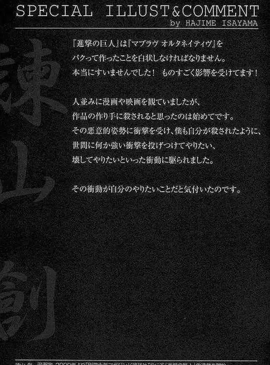 “我感受到特别短篇版《进击的巨人》所拥有的爆发力,“自己如果不画出这部作品就无法迈向明天”,谏山老师身上就隐藏了这样一股能量。我还记得,自己当时夸奖了他这一点,却也给了“你的画有点脏,还要加把劲才行”的建议。 ”——川漥慎太郎(进击的巨人·攻之书)