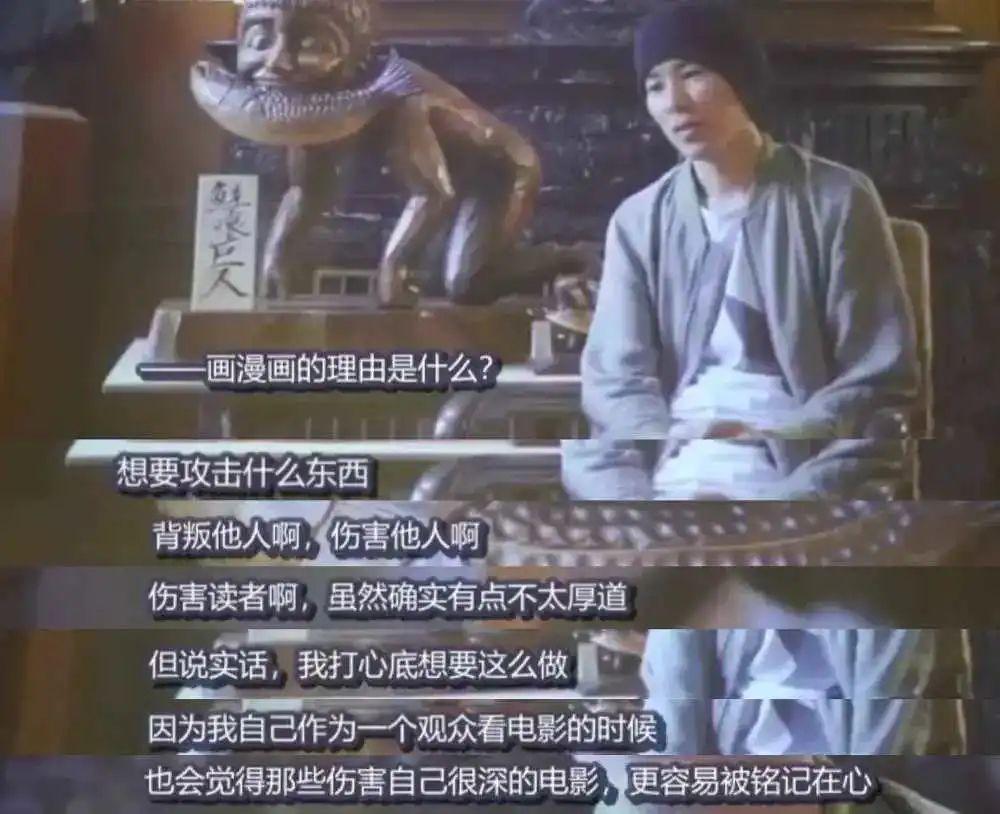我应该是个挺有攻击性的人。总想着要攻击什么。现实生活中当然是不可能的,但我觉得漫画不就是为此而存在的么?于是觉得画漫画会很快乐,便走上了这条路。但最近却时常觉得,其实驱动自己的,还是那种抑制不住的破坏欲吧。”