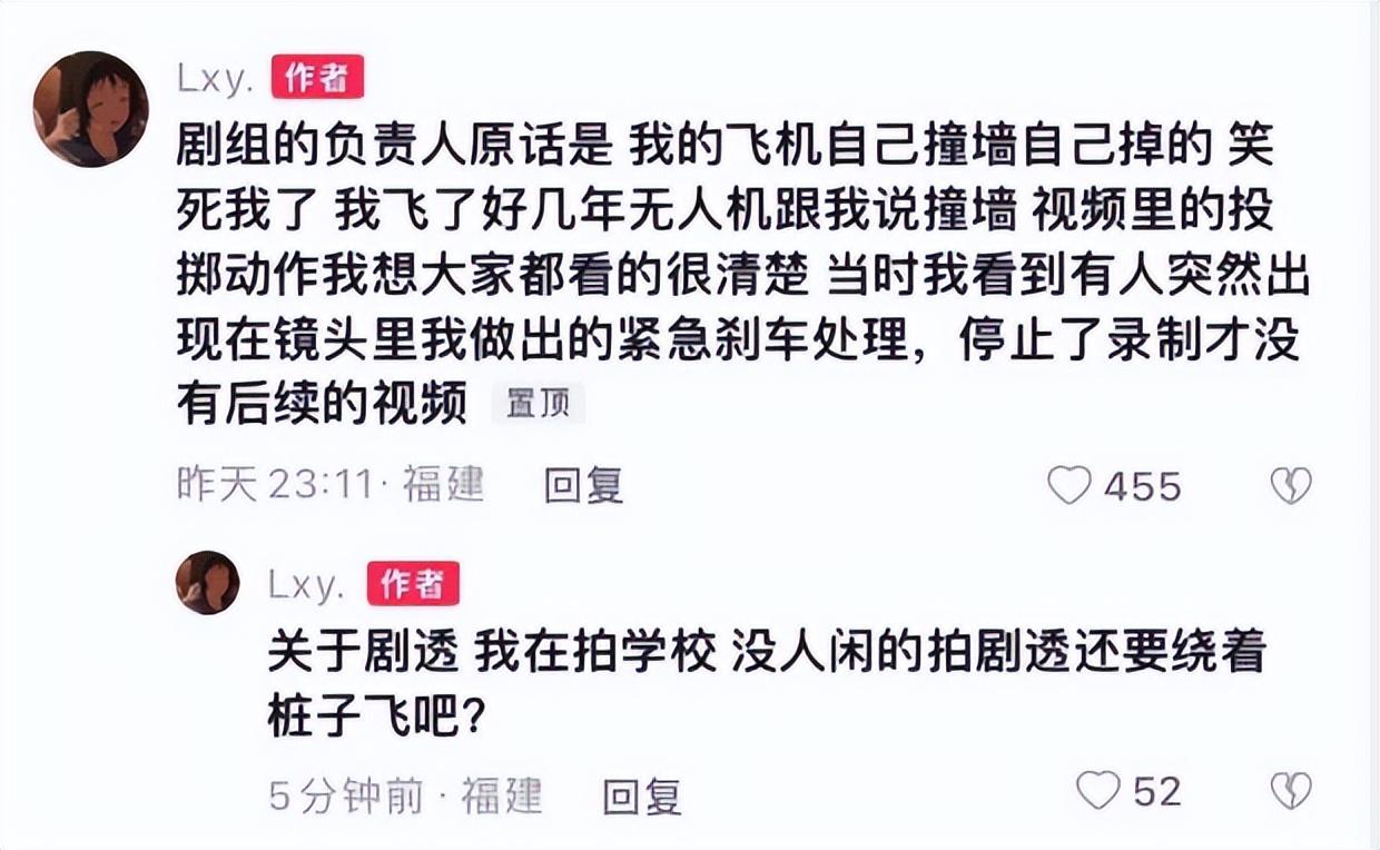 只是没想到偶然间,被剧组的工作人员撞到,就这样不分青红皂白地击落。值得一提的是,当这名同学,来到事发地时,剧组的人说:“无人机自己撞墙坠落了”。