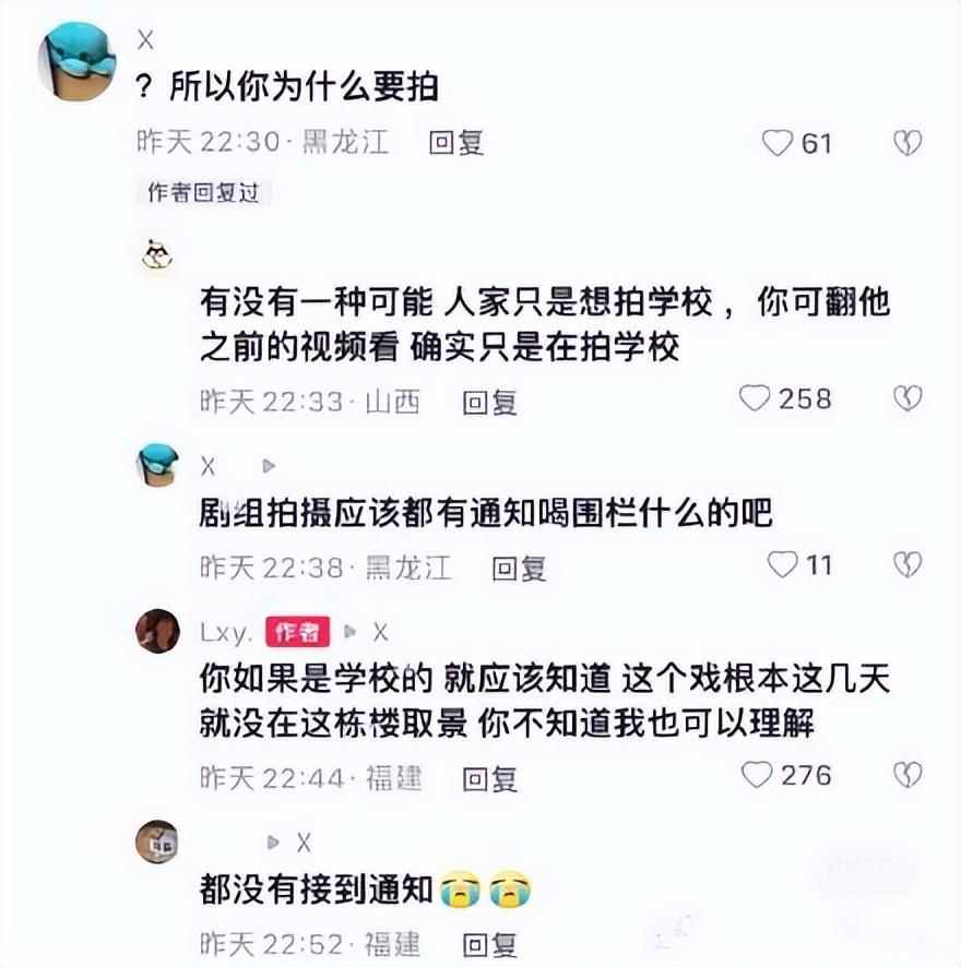 除此之外,该剧的拍摄,也影响了学生们的正常生活,拍摄的区域还出现了大量的仪器。甚至吃饭路过的时候,还会遭到斥责。