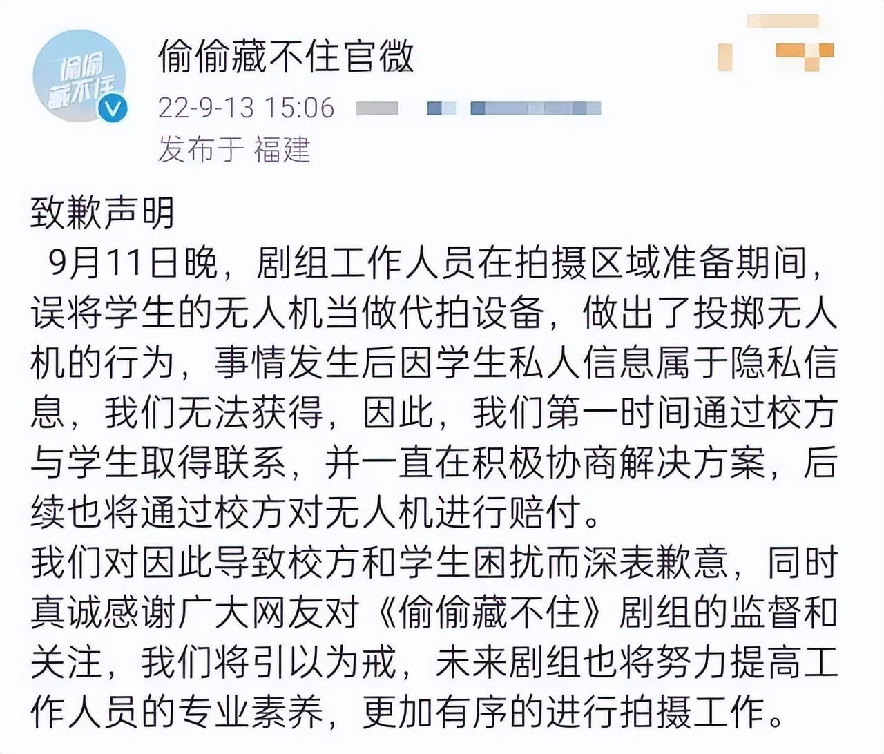 一架无人机对于学生党来讲也不便宜,希望《偷偷藏不住》剧组,尽快处理这件事情,切莫败坏了路人缘,影响后期的收视率。对此你们怎么看?