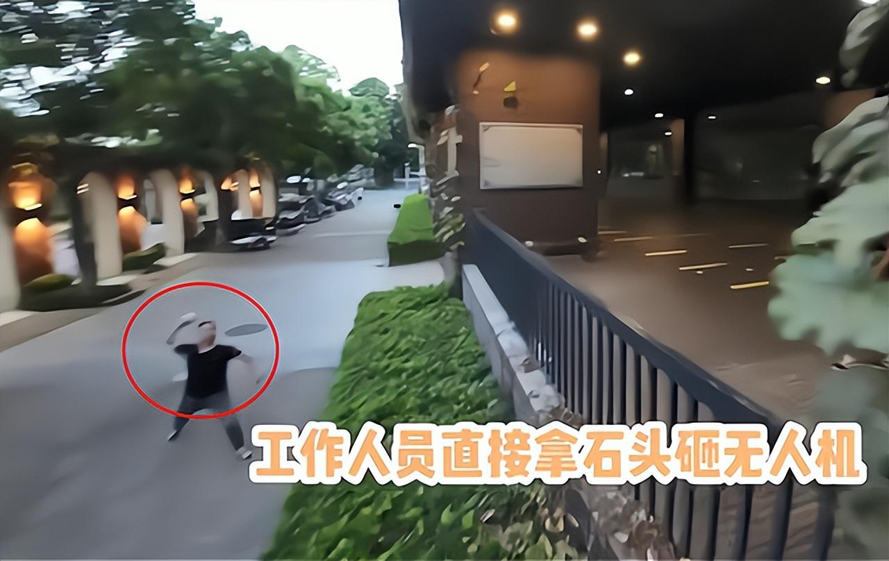 没想到,一个身穿黑色上衣的人,直接用手中的物品,砸向了无人机镜头,很明显这就是故意而为之。