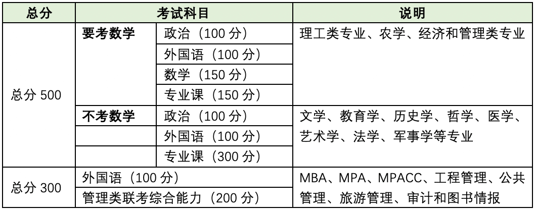 (1)绝大多数专业,考四门:2门公共课、数学+1门专业课或者2门专业课(不考数学),满分500分