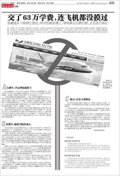 2015年3月,本报报道了蓝天飞院停止运营一事。