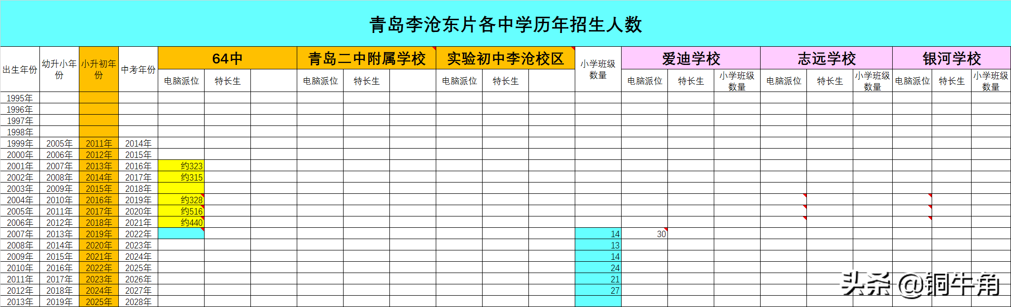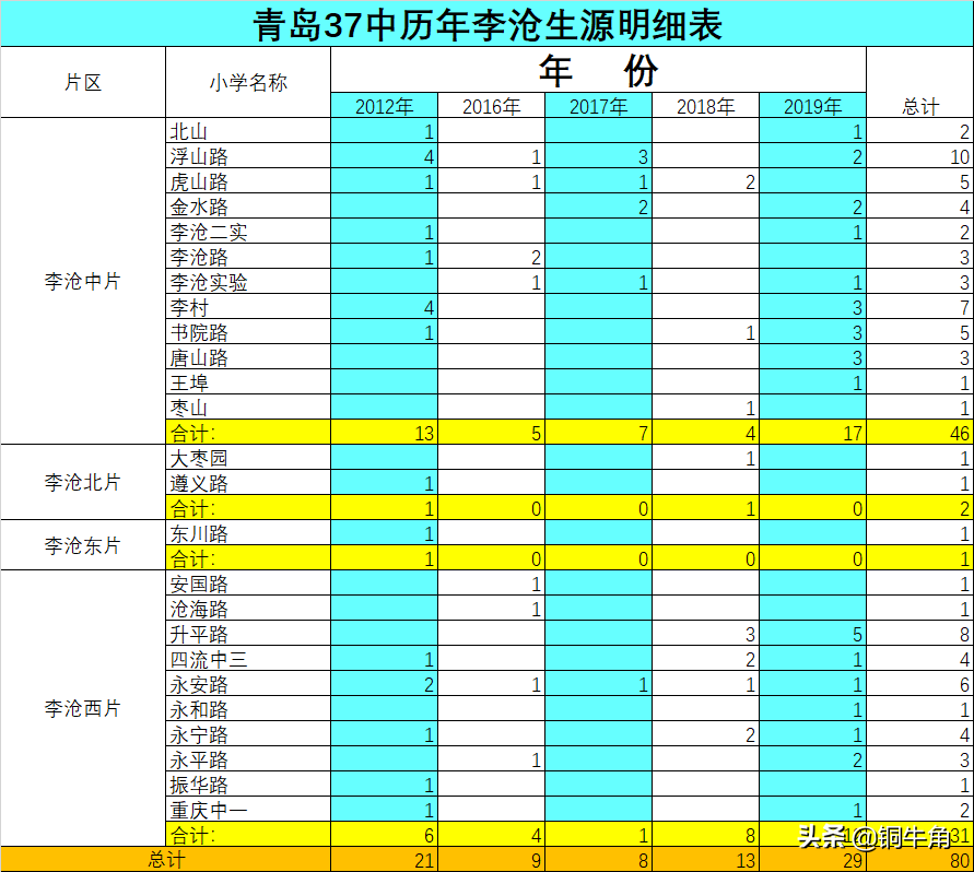 实验初中、青岛37中每年在李沧东片的招生人数,基本上到了可以忽略不计的程度,大家可以查阅下面的表格。