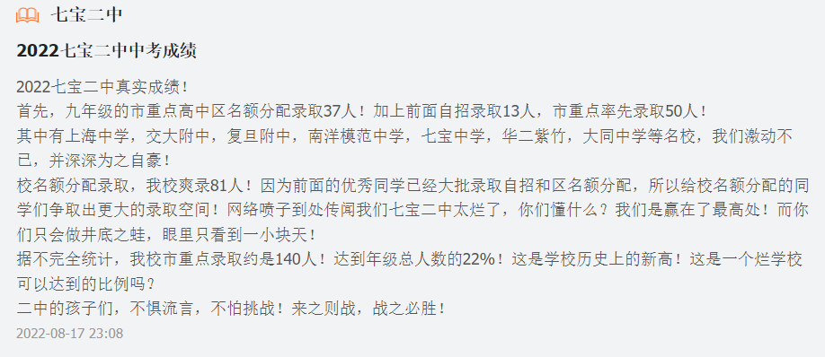 九峰实验的口碑一直都不错,也是松江区的王牌初中,2022九峰实验共208人进入市重点,四校录取21人。