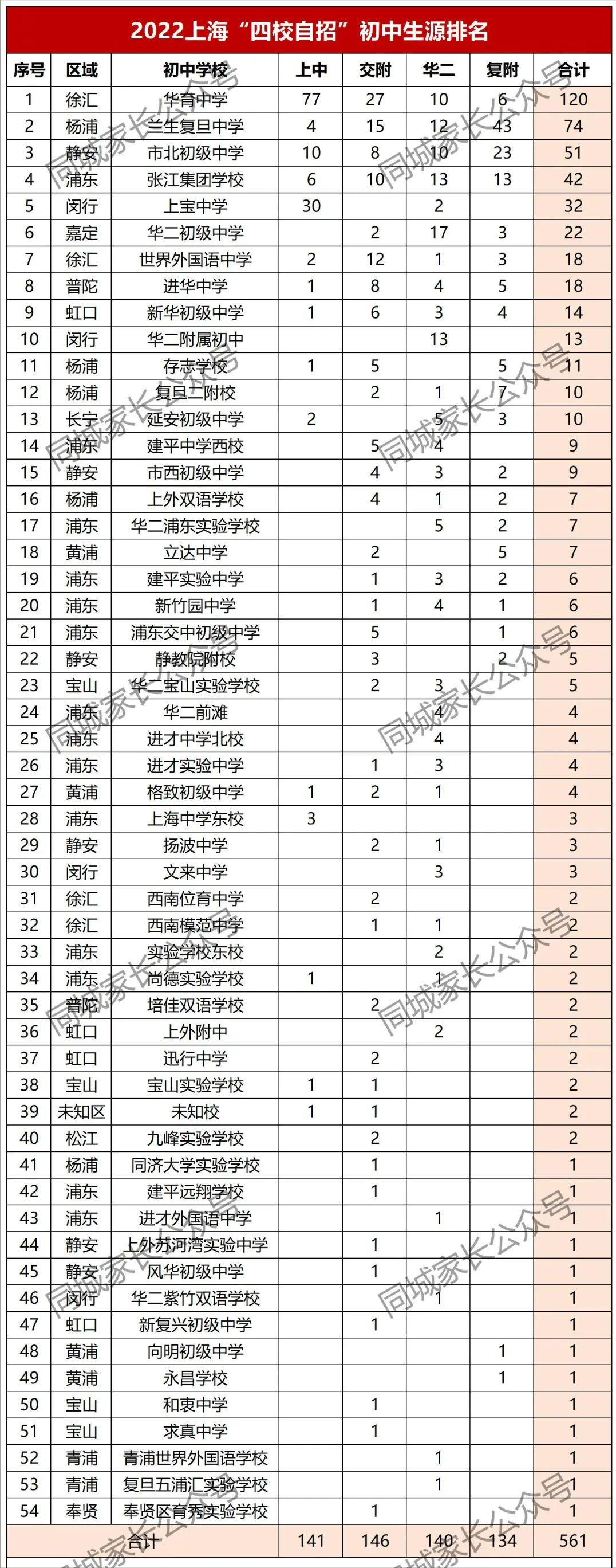 今年四校通过自招共预录561人,其中上海中学141人,交大附中146人,华二附中140人,复旦附中134人。