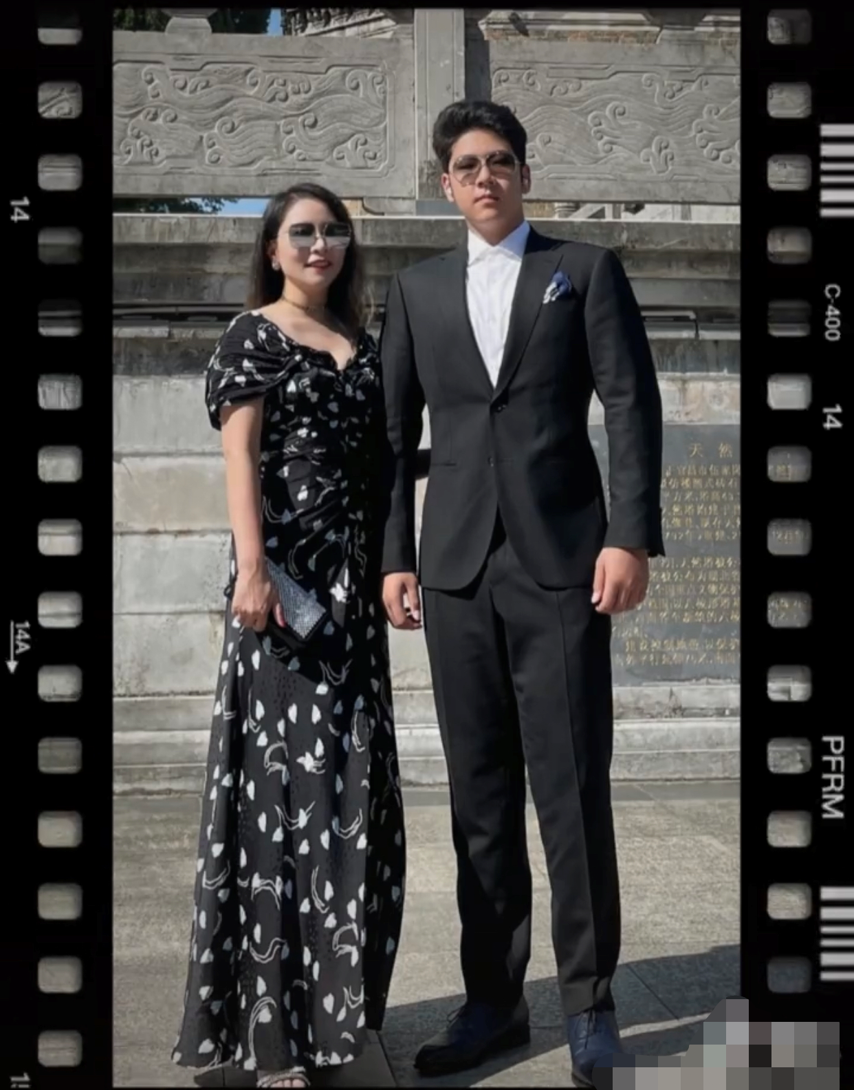 其中有一张照片更是令人惊叹不已。照片中,14岁的石头穿着利落又正式的西服套装,脸上戴着墨镜,头发梳得整齐光亮。许久不见,体型壮硕,身高猛长的他,宛如一个巨人,比身旁的妈妈还要高出大半个头。