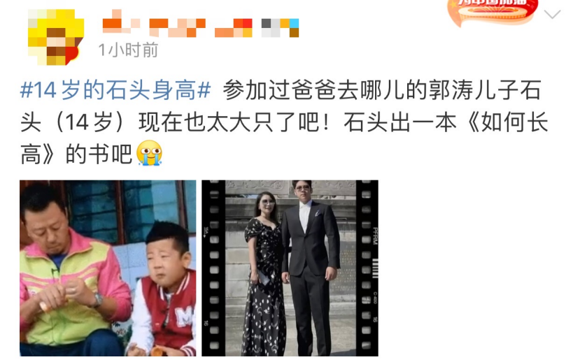 9月23日,有媒体曝光郭涛儿子石头的近照,其超高的身高,引发网友热议。