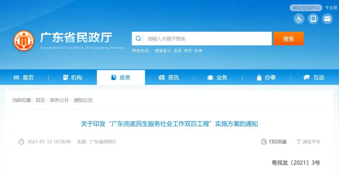 2021年广东5部门联合印发《“广东兜底民生服务社会工作双百工程”实施方案》,明确规定了新时代政府主导的社会工作的发展方向和要求。