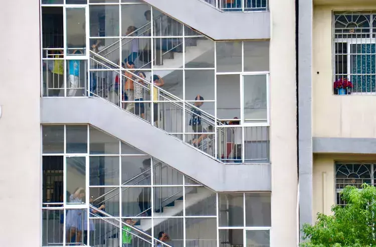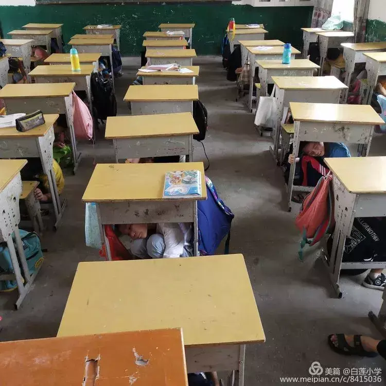 下午4点20分伴随第一声急促的防空警报拉响,正在上课的学生在老师的指导下,迅速用书包护住头部,并蹲在课桌下,就近避险。在第二声警报拉响时,全校同学在老师的指导下,按照既定路线迅速有序撤离。整个疏散过程用时2分30秒。