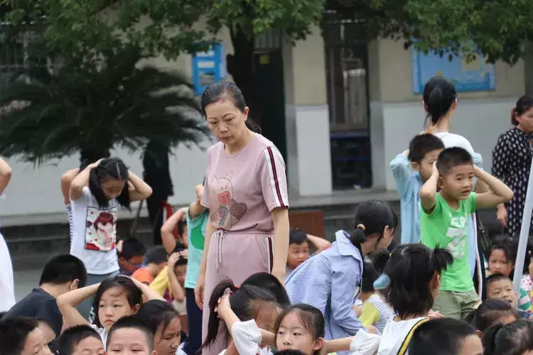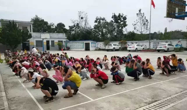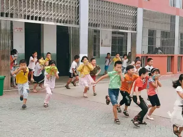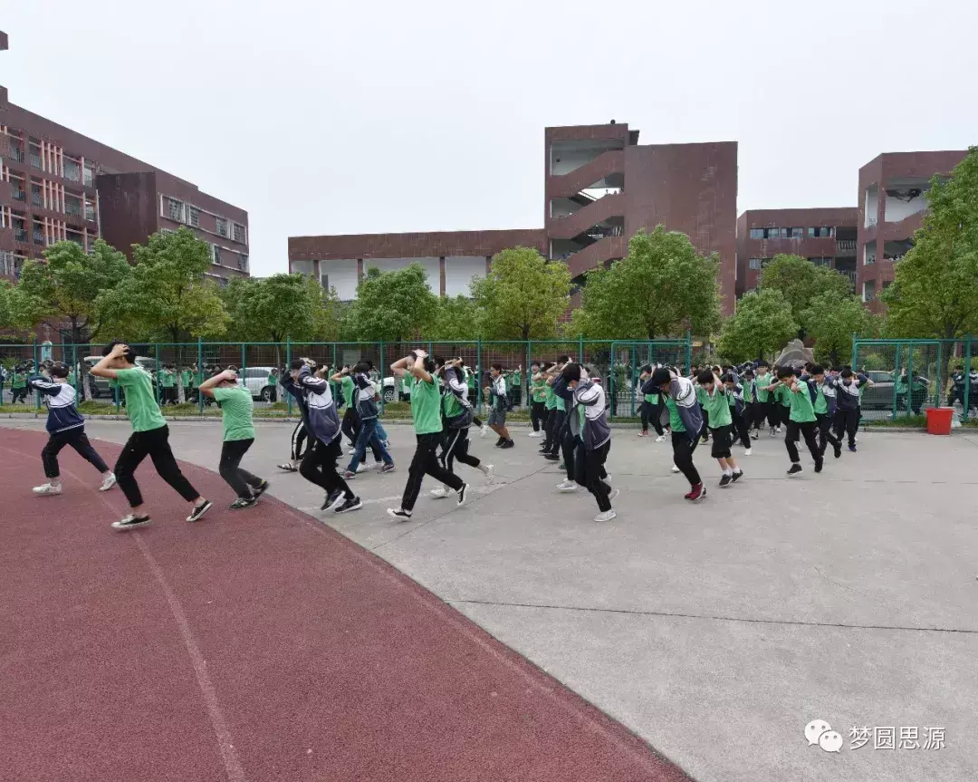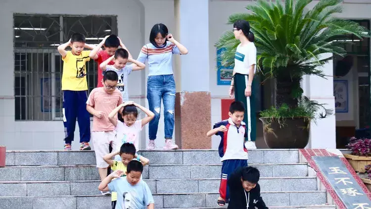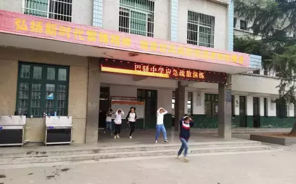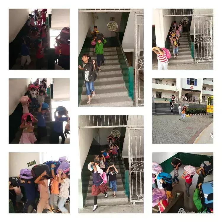 9时整,长哨声响起,学生进行紧急疏散。各班班主任迅速带领同学们护住头部按照预先设定好的撤离路线,撤离到学校操场的安全地带。