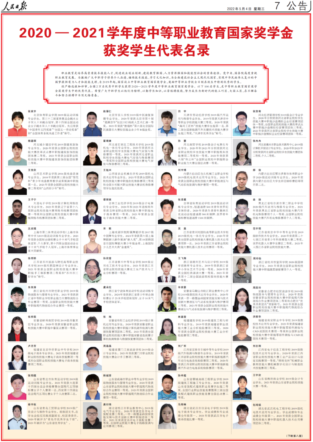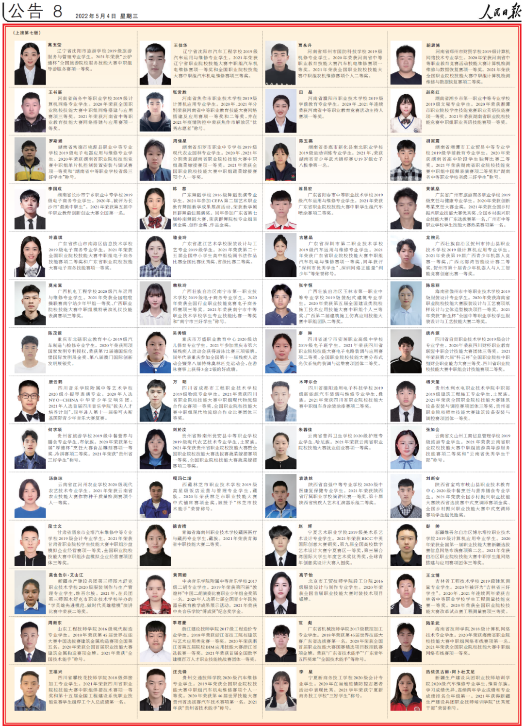 5月4日出版的人民日报,用四个整版刊登了100名本专科生国家奖学金获奖学生优秀代表和100名中等职业教育国家奖学金获奖学生优秀代表名录。