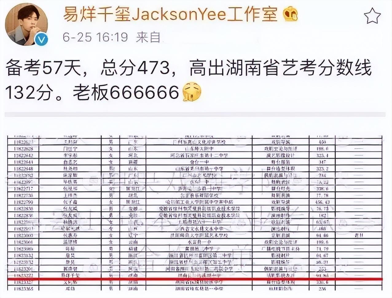 不过,即使是这样,易烊千玺最后还是以文化课和艺术课双料第一的成绩被中央戏剧学院录取,而文化课总分为473。