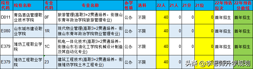 李老师根据位次法,结合李老师创立的山东新高考一段线上考生位次修正系数(1.08),对2022年各个3+2专业做出投档位次估测,详见下图。