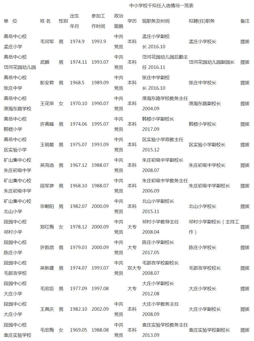 马辉,男,汉族,中共党员,1980年8月出生,籍贯安徽濉溪,大学学历,市实验高级中学教师,拟聘任为市第五中学副校长;