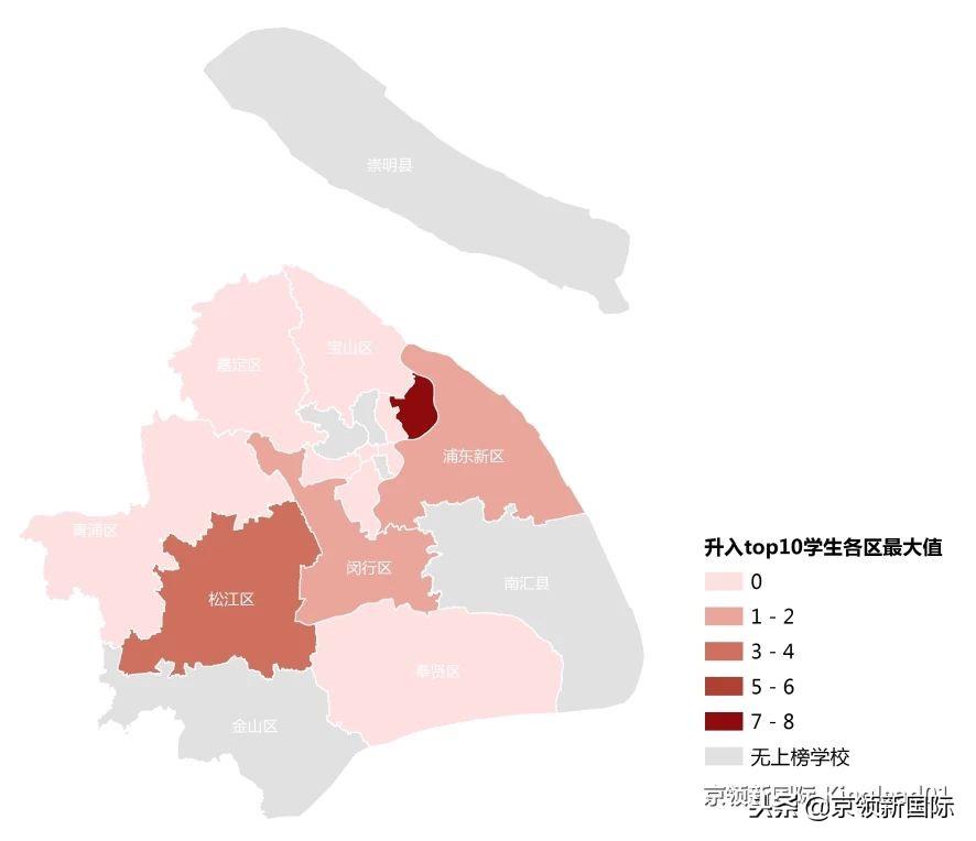 上海各区国际学校升入TOP10大学最大学生数量分布