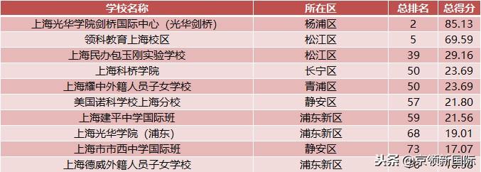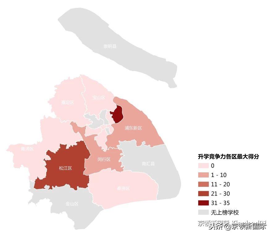杨浦区的上海光华学院剑桥国际中心的升学竞争力得分为全市最高,为34.93分;松江区领科教育上海校区升学竞争力得分位列全市第二,得分为20.53,同区中上海民办包玉刚实验学校紧随其后;上海光华学院在浦东区升学竞争力得分最高,上海七宝德怀特高级中学在闵行区升学竞争力得分最高;