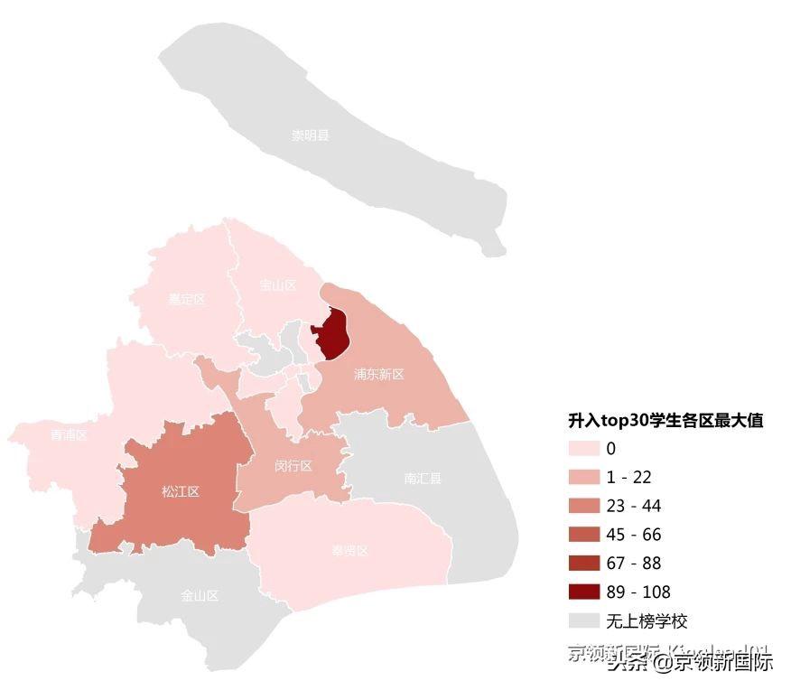 上海各区国际学校升入TOP30大学最大学生数量分布