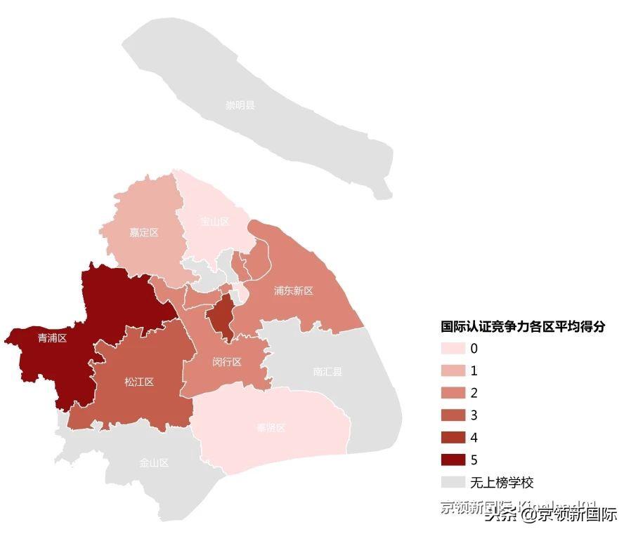 在上海上榜的国际学校分布的13个区中,青浦区的上海耀中外籍人员子女学校国际认证竞争力最高,同时也全榜最高。浦东新区的上海德威外籍人员子女学校位列上海第二,全榜第五。
