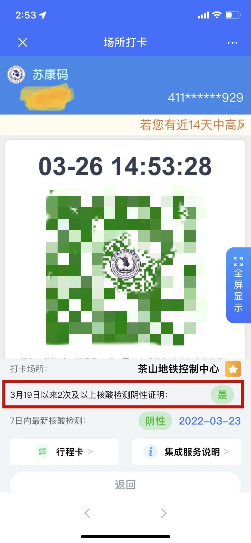 扫码后,场所码界面会显示健康码颜色、打卡场所名称、3月19日以来2次及以上核酸检测阴性证明情况和7日内最新核酸检测结果。