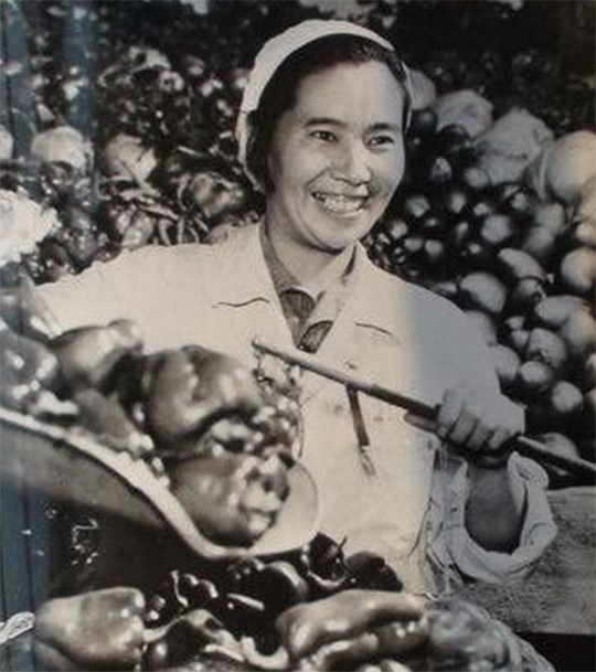 目测三十五岁左右,她站在一堆辣椒、白菜之中,卷起袖子的左手提着秤杆,图片下的小字道明了她的身份:商业战线"学习毛主席著作标兵"、沈阳和平副食品商店营业员李素文。