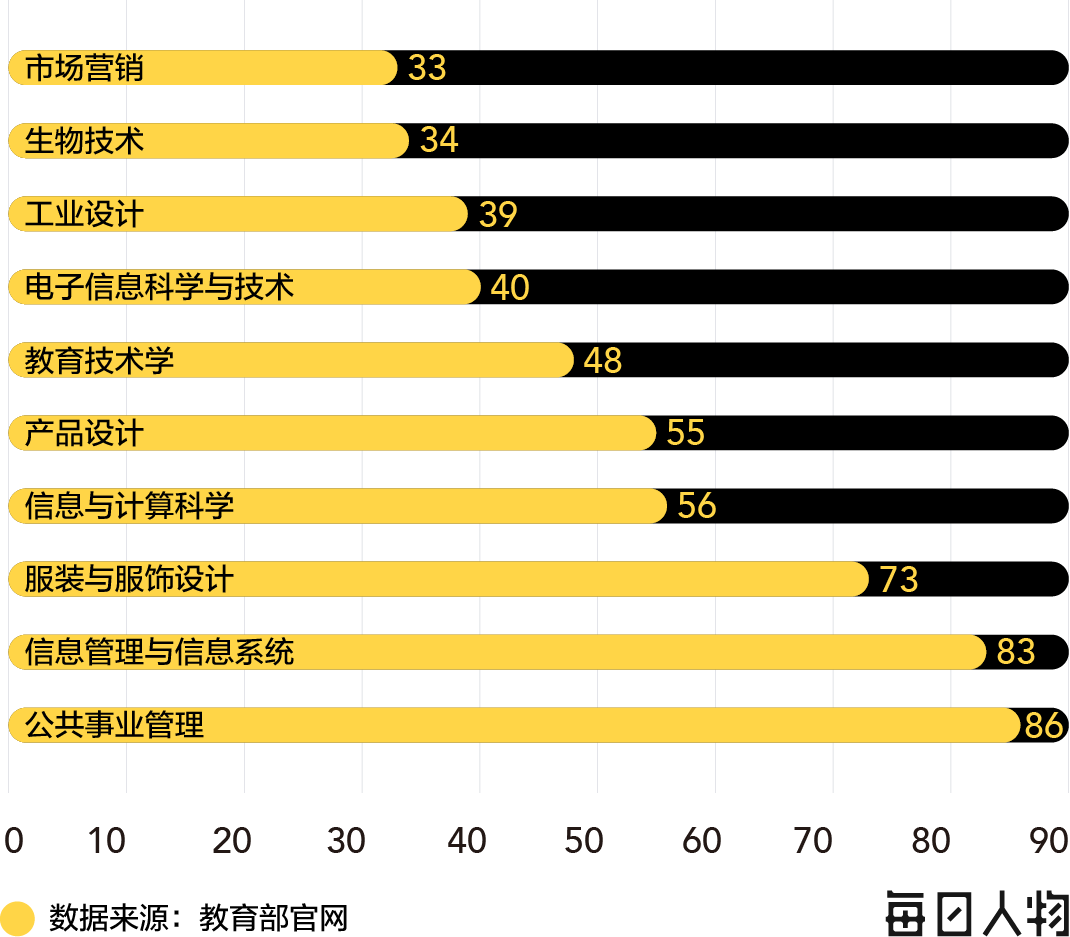 再看被裁撤的。近五年来被裁撤数量最多的是公共事业管理专业,裁撤数量达到86个。其次是信息管理与信息系统专业,共裁撤了83个。