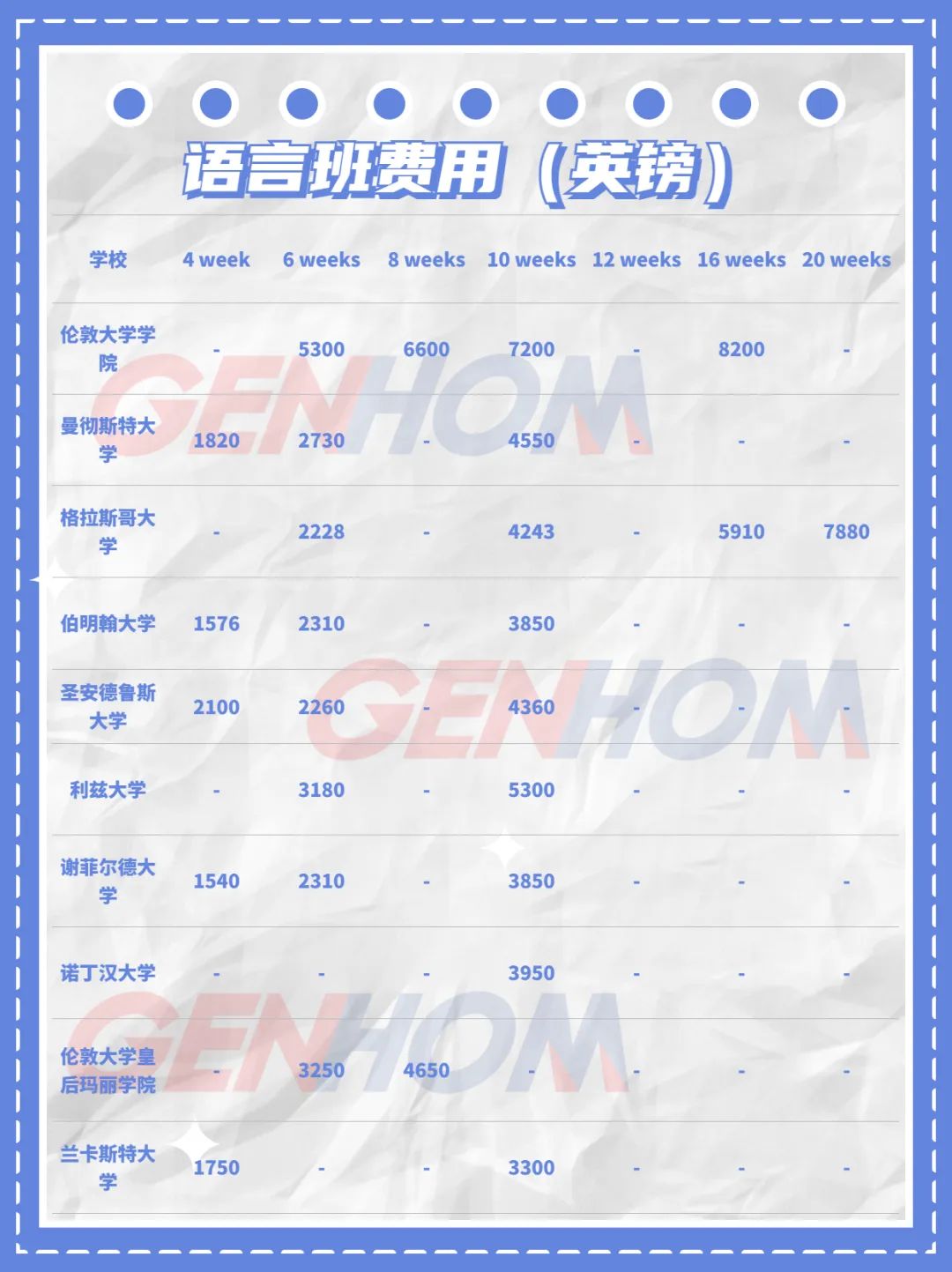 没能达到语言成绩要求的同学,一般要从6周读起。从整理的情况来看,6周语言班基本都是2000镑以上,算上英国的住宿费和生活费,也是笔不少的费用。