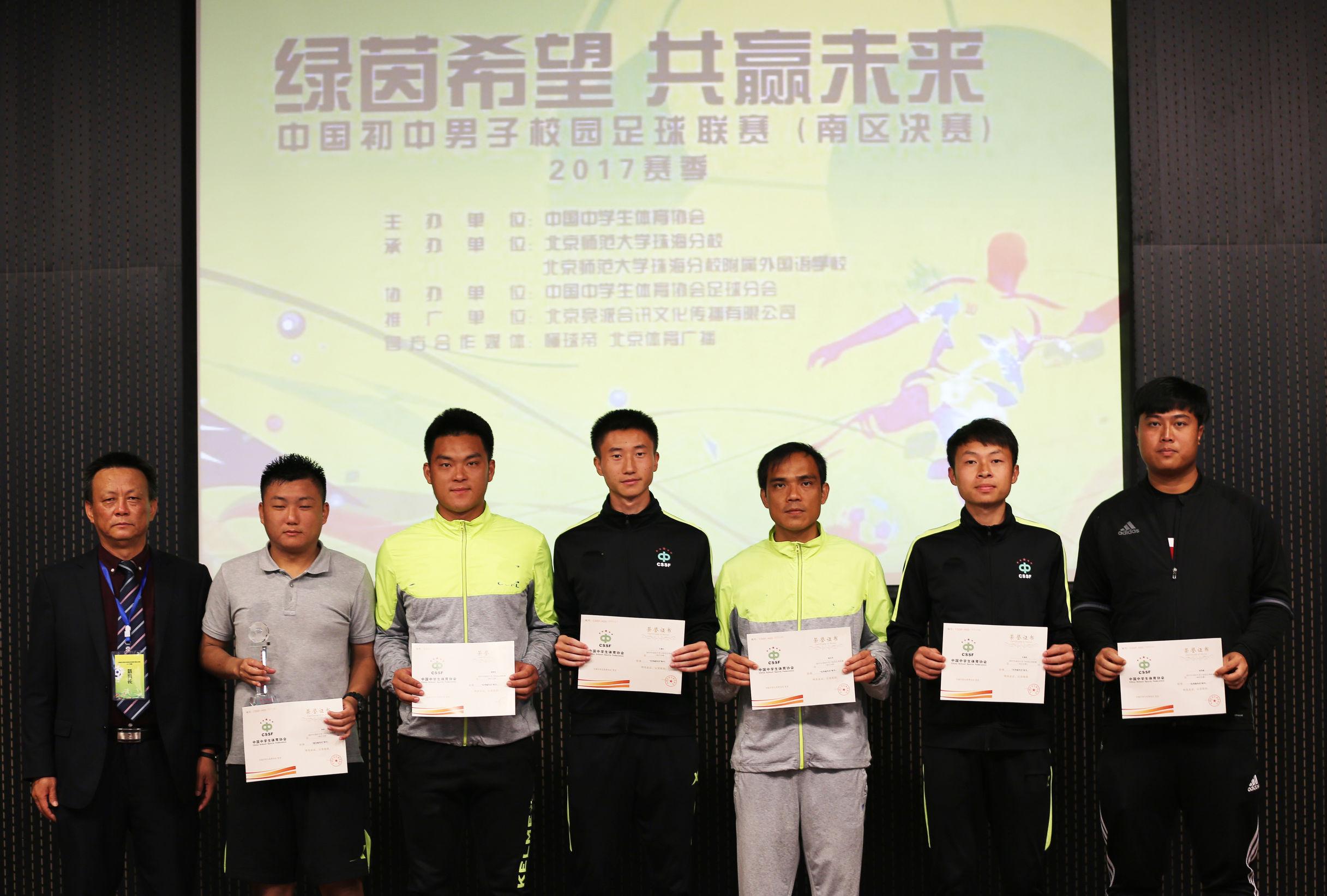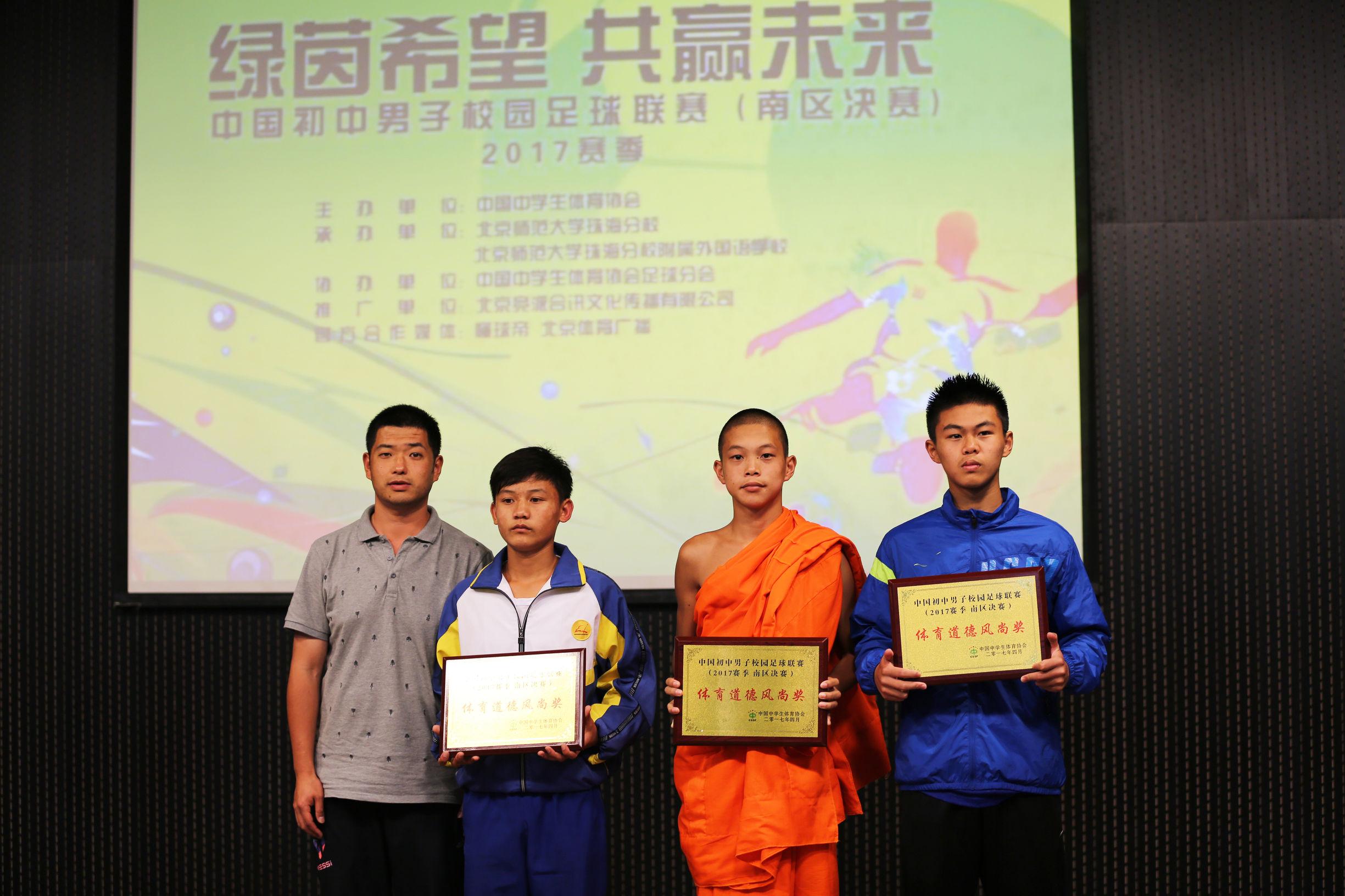 闭幕仪式上,北京师范大学珠海分校附属外国语学校常务副校长张义山、中国中学生体育协会足球工作部项目主管田靖夫、本次赛事比赛监督张廷安、王海、裁判长皮德华、副裁判长张拥军、黄朝辉、赛事竞赛部官员高凯分别为体育道德风尚奖、冠亚季军、最佳单项奖、体质测试优秀团队及个人颁奖。
