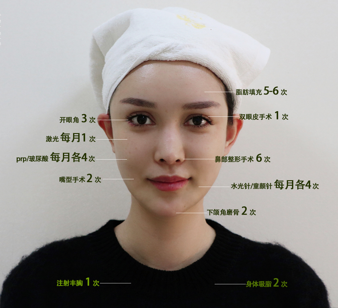 19岁到29岁,10年间,吸脂、隆鼻、下巴脸型、双眼皮、开眼角、丰胸、微笑唇等等