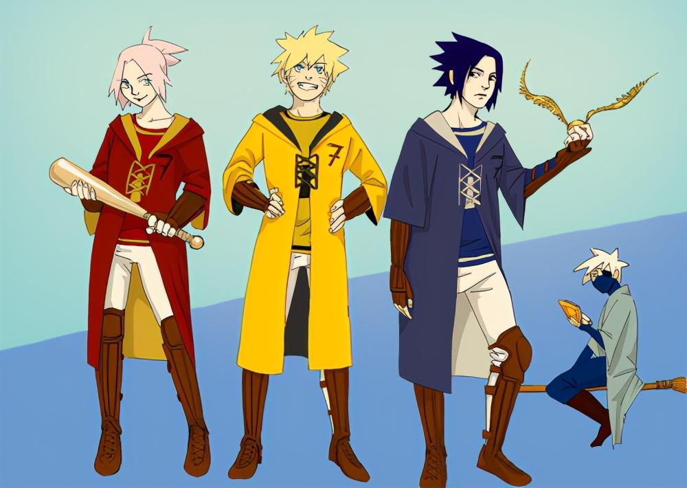接着我们来看看霍格沃兹版的火影忍者。首先主角团三人换成哈利波特主角三人,竟毫无违和感,佐助戴上眼镜就是哈利,鸣人冒冒失失是为罗恩,而小樱喜欢佐助、专注怼鸣人,恰好就是赫敏(这里没有说赫敏喜欢哈利的意思)。