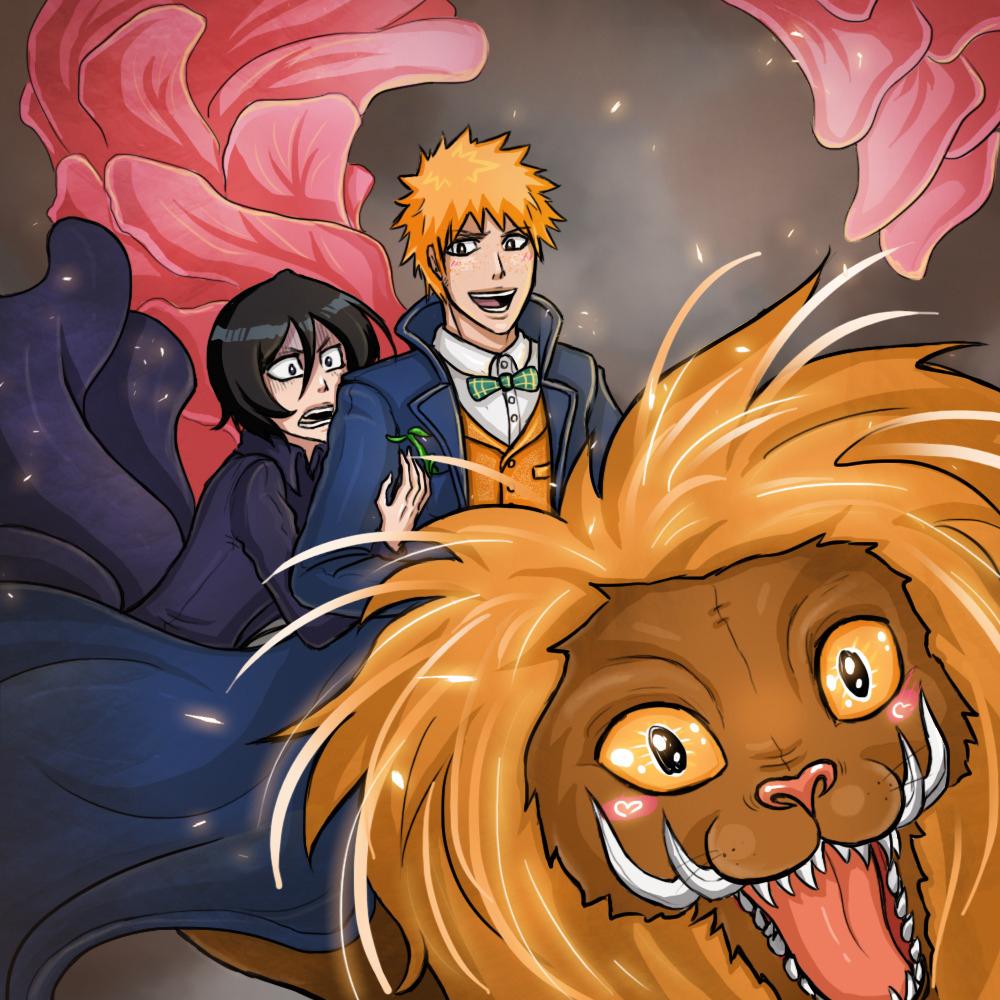 上面两张的画风非常欧美。而下图一护和露琪亚的非正统CP,在格兰芬多狮子的抢镜下,似乎不显突兀。