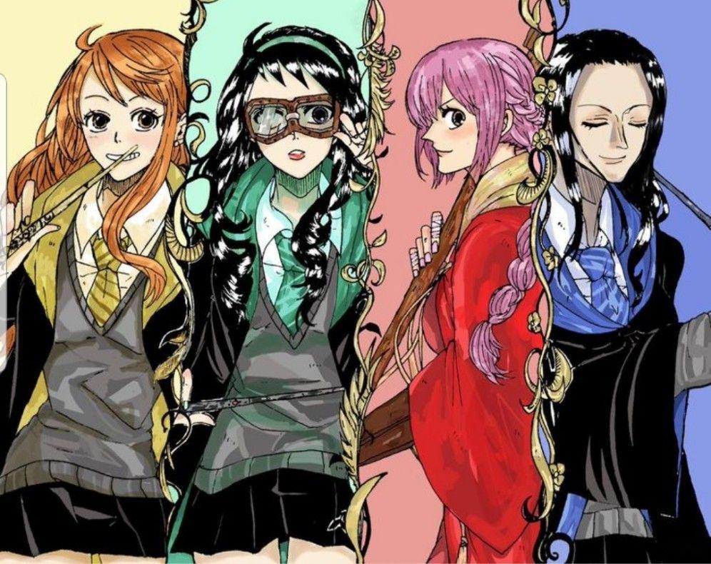 首先是目前仍在更新的海贼王。当草帽团组队在霍格沃兹进行学习,竟只有娜美是斯莱特林,而乌索普、乔巴、弗兰奇是正直忠诚的赫奇帕奇,罗宾、布鲁克一个靠智商、一个靠年龄称为聪慧博学的拉文克劳;最后是草帽团三强,他们属于热情勇敢的格兰芬多。