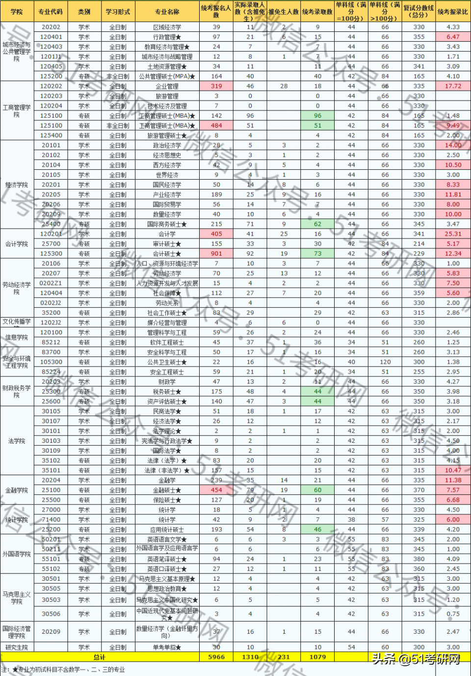 专业较多不再一一列举,下面为详细统计数据,包括报录人数及报录比,复试分数线,非常详细,大家可以参考具体报考专业近几年的涨降情况。