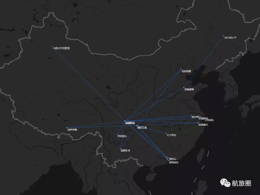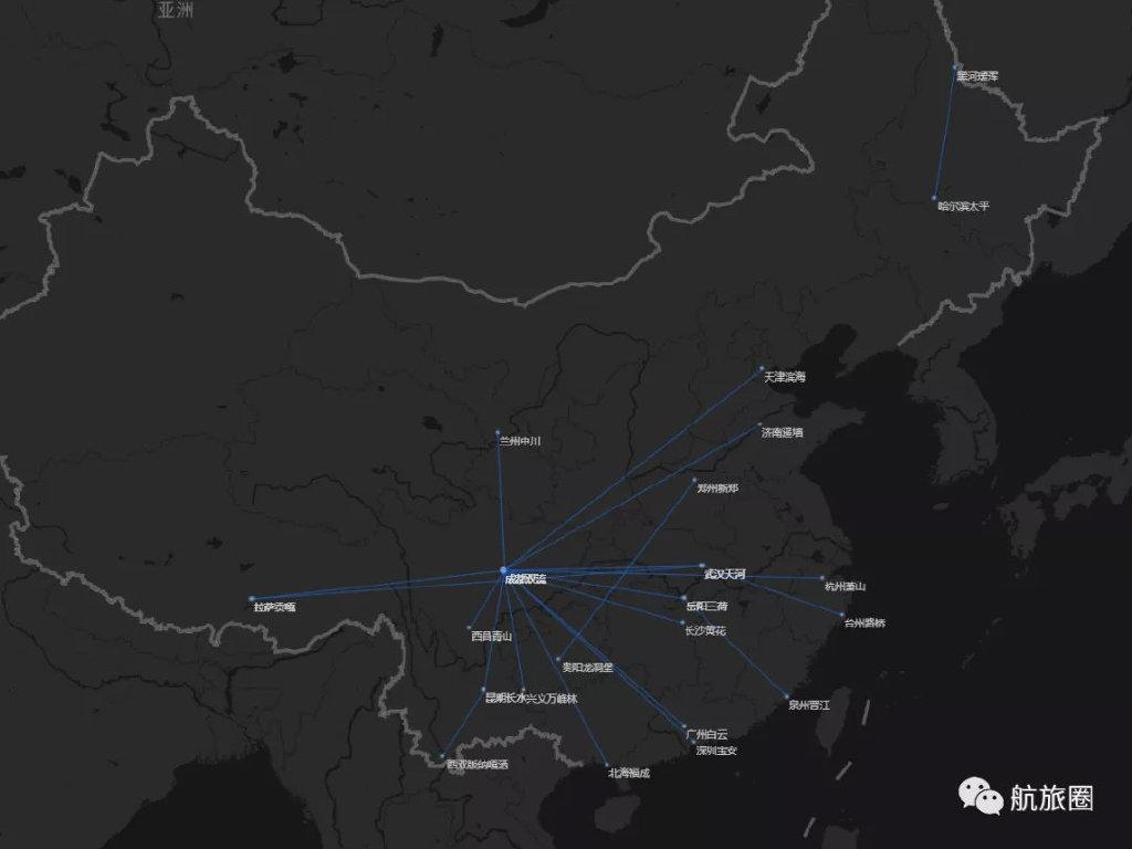 西藏航空最繁忙的20条航线也呈双枢纽布局,10条涉及拉萨、8条涉及成都。