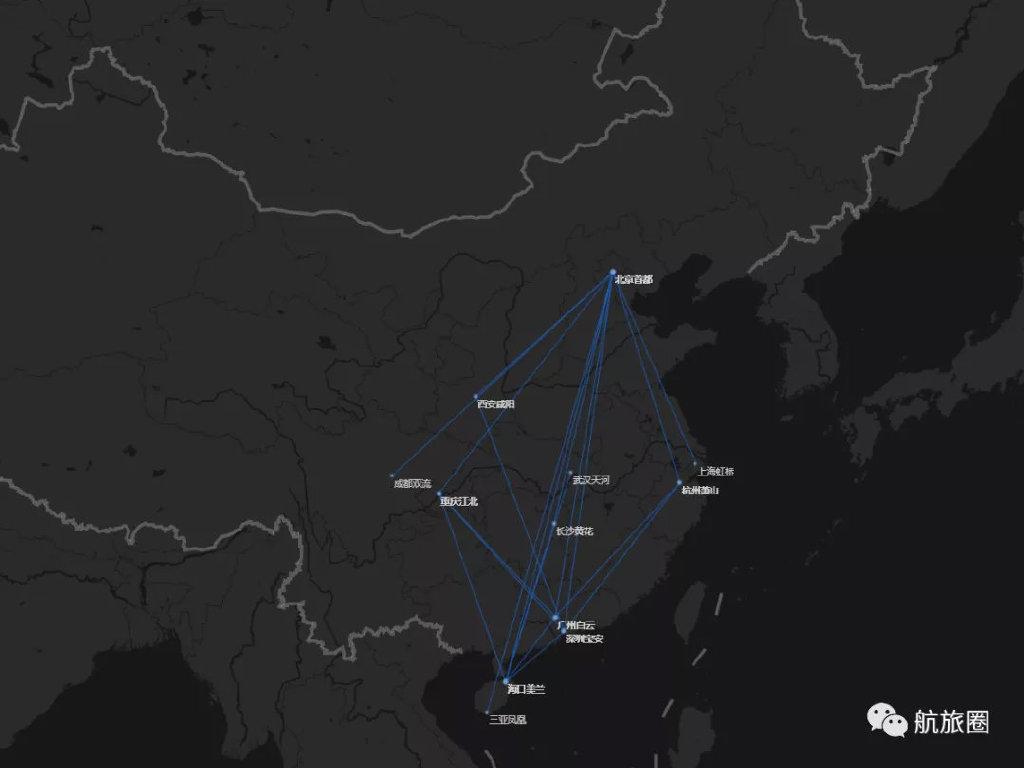 海航最繁忙的20条航线,分布在北京、海口、深圳、广州、重庆等多个枢纽,且各个枢纽之间也有大量航班连接。