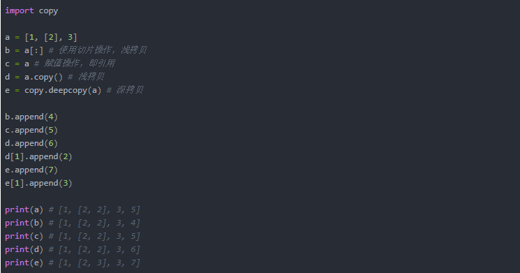 在下面的代码中包含了赋值、浅拷贝和深拷贝,在Python中赋值即引用对象,所以对c操作也就是对原对象a进行操作,对于浅拷贝对象b和d,对其中的引用进行操作会改变对a中的对象,而对深拷贝对象e进行操作就与原对象a无关了。