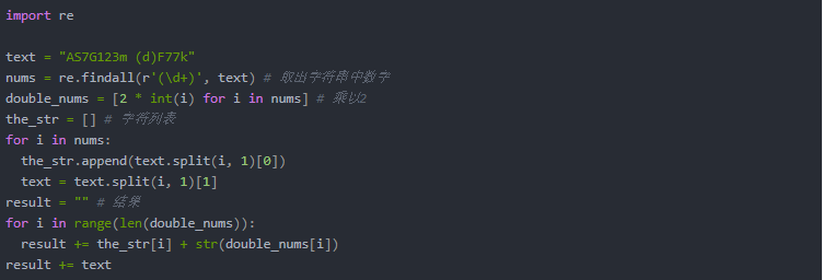 个人思路:先用正则表达式将其中的数字匹配出来进行乘2操作,然后将字符串根据其中的数字进行切割,得到一个字符列表,最终将乘以2后的数字和原有的字符进行拼接得到最后的结果。(我脑子比较笨,想不到别的,如果您有更好更简便的方法,希望可以分享一下!)